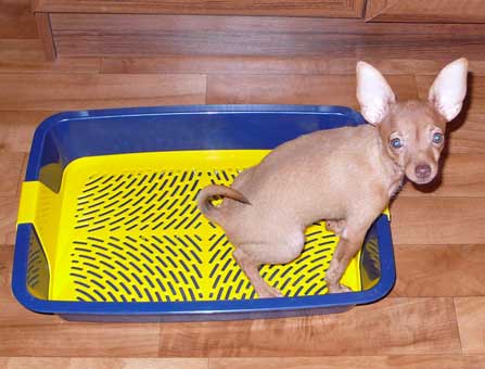 В определенном месте квартиры ставится лоток, застеленный газетами. Лоток должен быть в 2-3 раза больше стандартного кошачьего. После КАЖДОГО сна и кормления щенка со словами “Делай дела” ставят в лоток, ему аккуратно массируют живот и не отпускают, пока щенок не покакает и не пописает. Очень важно каждый раз, когда щенок во время игры захочет в туалет, успеть отнести его в лоток. Этим способом вы приучаете щенка не только не пачкать в доме, но и ходить в туалет по команде. Приучение к туалету этим способом несколько сложнее, чем первым, но он очень поможет вам к приучению щенка ходить в туалет на улице.